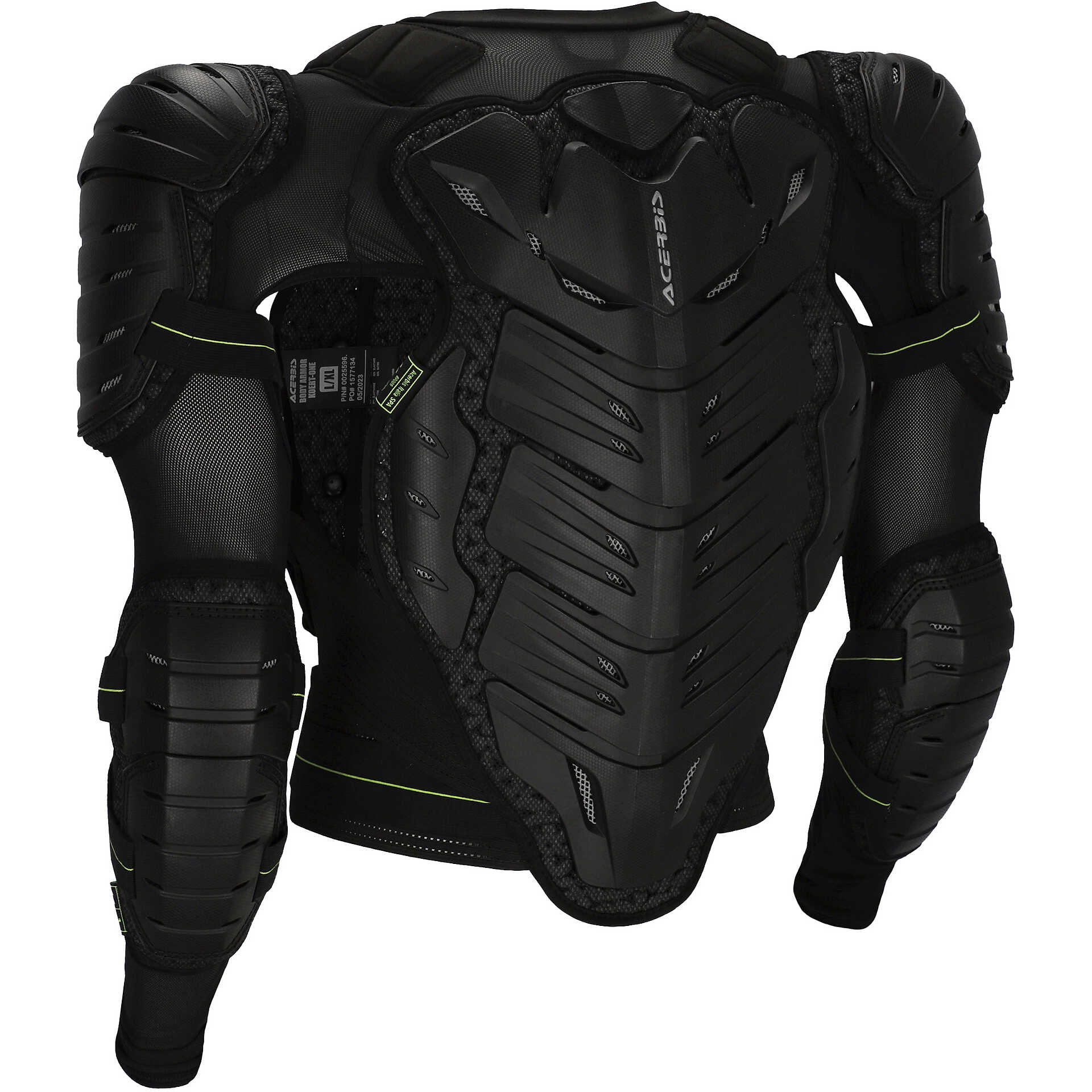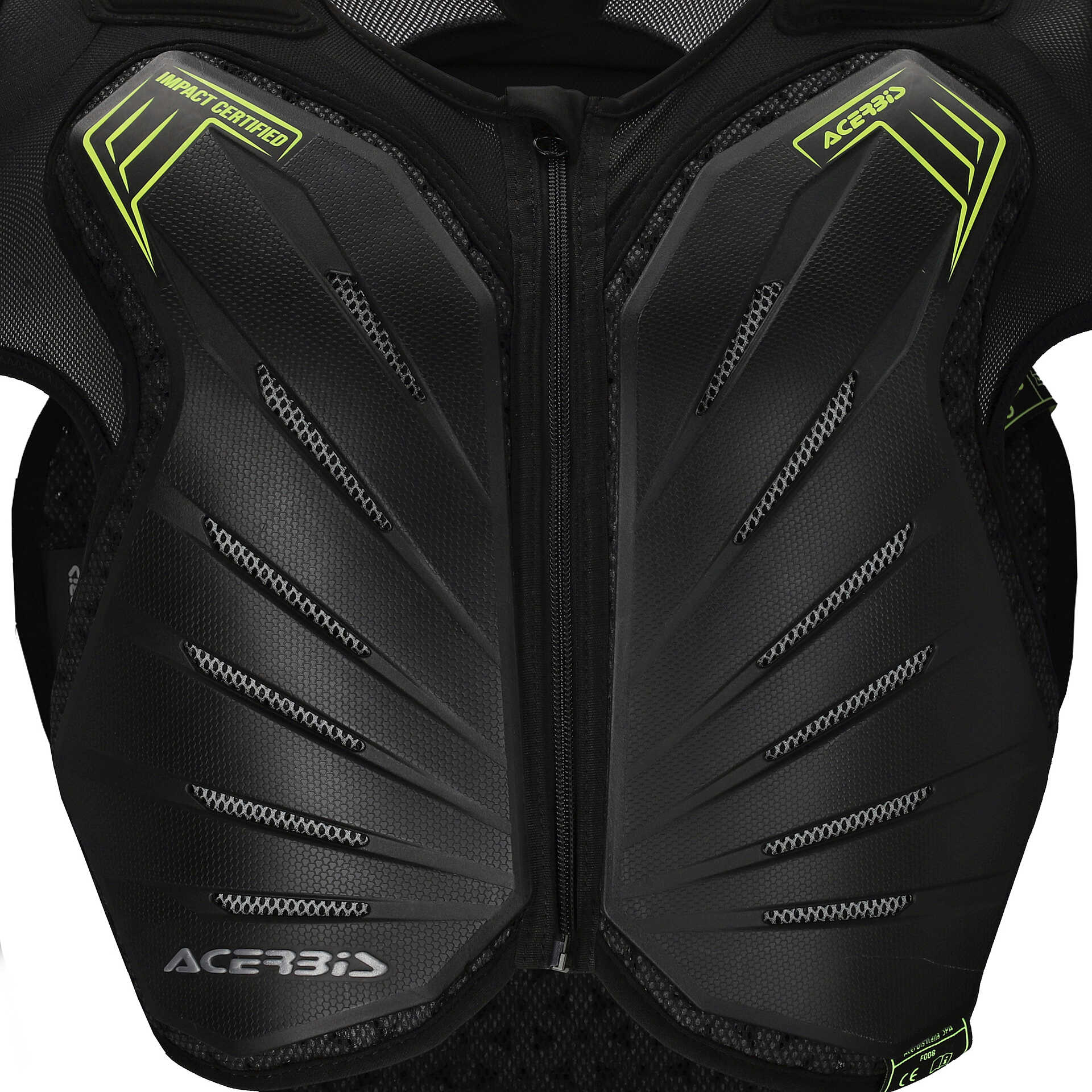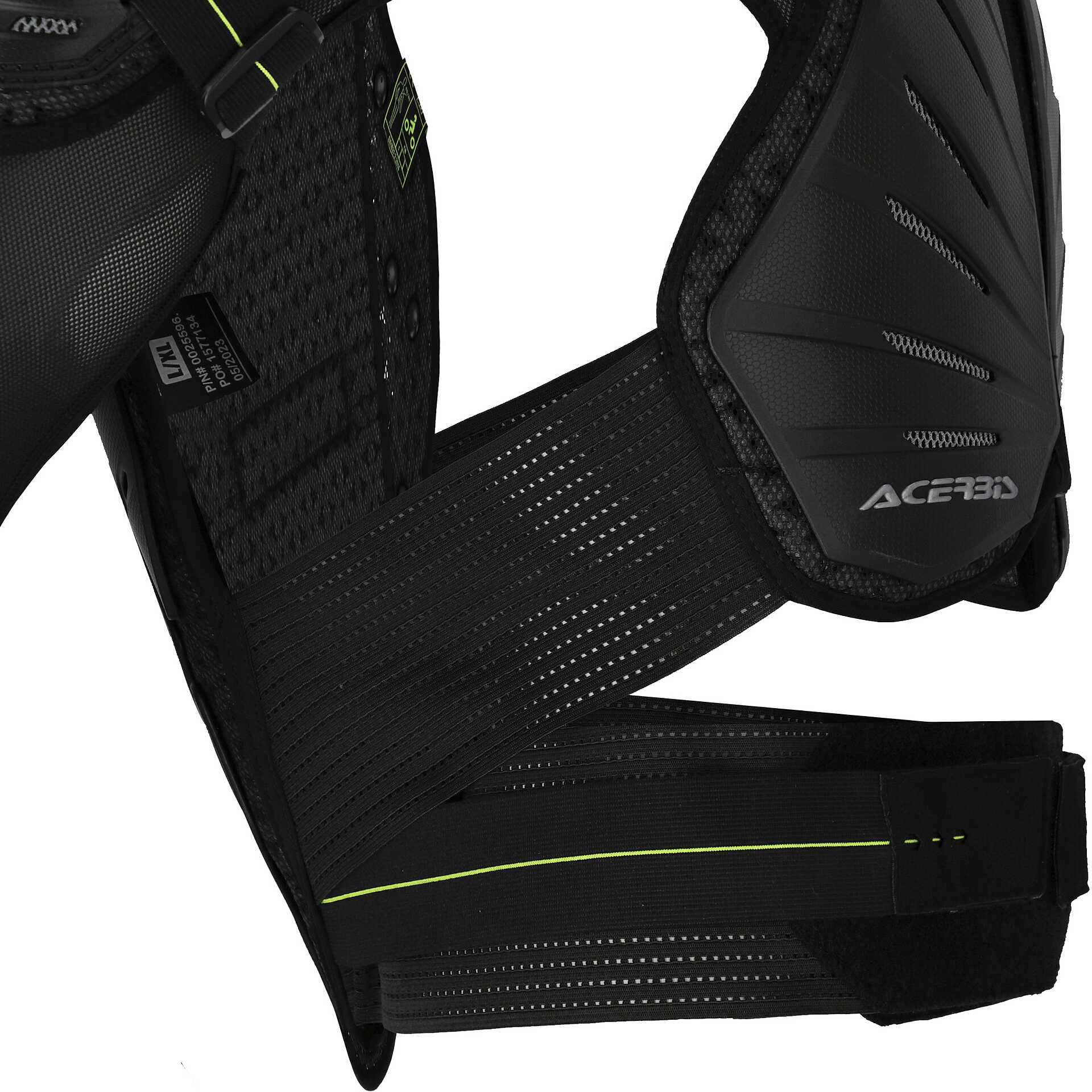 - Insert with Acerbis logo on front and back plastics. Looped homologation labels under plastic on chest, back, left shoulder and left elbow.
